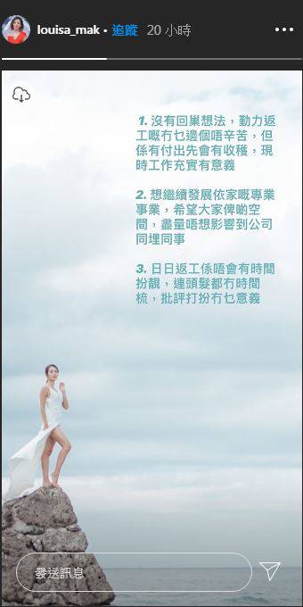 對於被媒體爆料,麥明詩則在IG澄清,表示自己並沒有要回歸的想法,她直言努力工作有誰不辛苦,但是有付出才會有收穫,現在的工作充實有意義,同時表達自己很積極想發展現在的事業,並且希望大家不要影響到公司同事,最後被拍到樸素的模樣,她無奈透露,每天工作沒有時間扮美,連頭髮都沒有時間梳,批評打扮沒有意義。